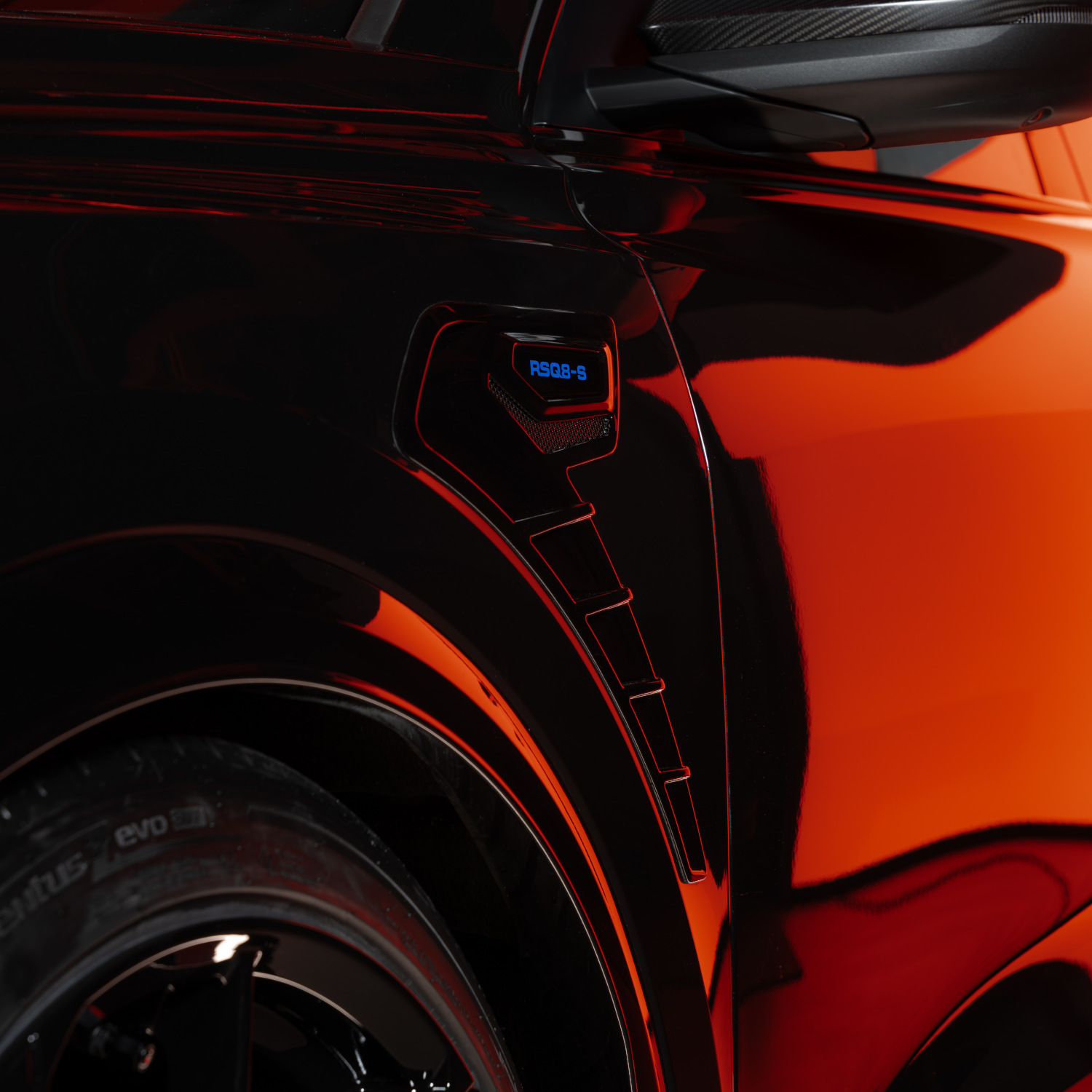 Der Frontspoiler aus mattem Sichtcarbon setzt eine klare Linie – selbstbewusst, präzise, unübersehbar. Die schwarz glänzende Radhausentlüftung am vorderen Kotflügel mit integrierter RSQ8-S Emblemplakette unterstreicht den markanten Auftritt. Am Heck schließt der Heckflügel aus mattem Sichtcarbon die Silhouette markant ab.