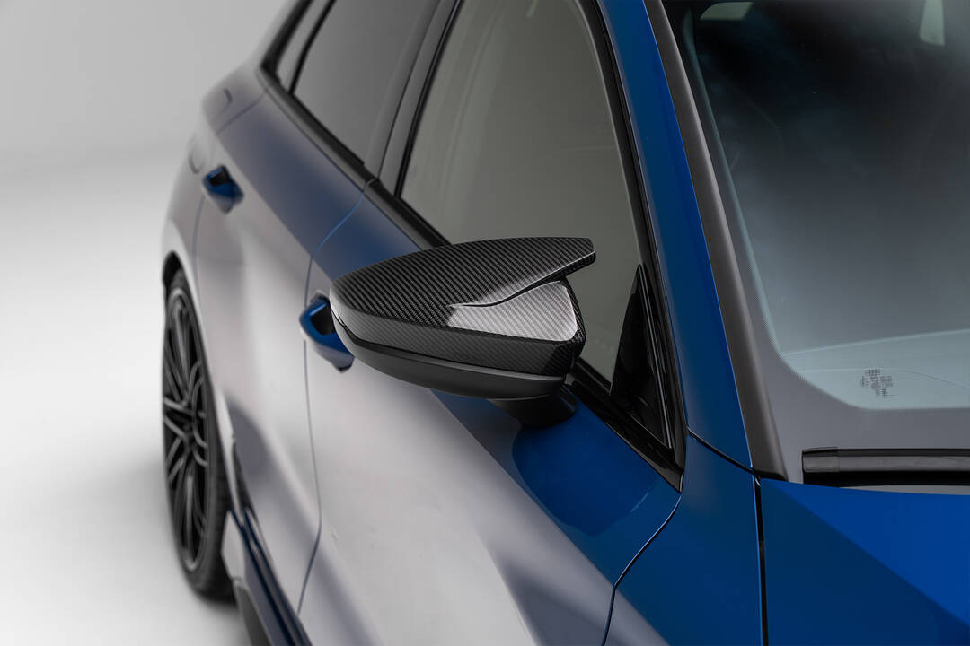 Nicht weniger sportlich ist das äußere Erscheinungsbild des Kurvenvirtuosen. In glänzendem Sichtcarbon ausgeführte Aerodynamik-Komponenten akzentuieren den athletischen Auftritt des RS3-R. Von der ausdruckstarken Frontpartie mit Spoiler und Frontflics, die fließend in die neuen Linien des Facelifts übergehen, über die dynamischen Spiegelkappen bis zum markanten Heckschürzeneinsatz – beim Sportback veredelt durch einen zusätzlichen Heckspoiler – betont die sportliche Silhouette des Hochleistungsmodells.